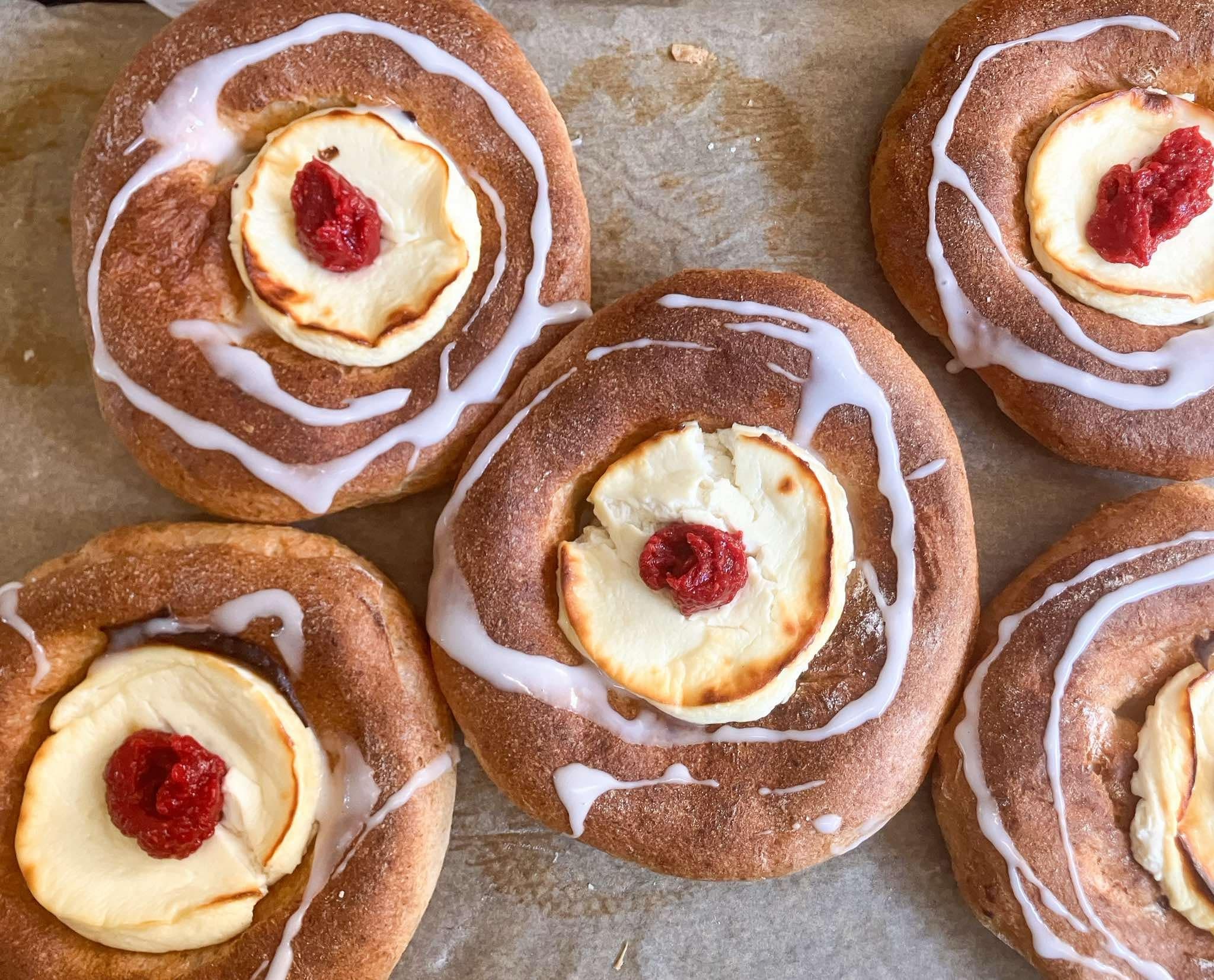 Sodkie bułeczki na zakwasie, robione na brązowym cukrze i prawdziwej oliwie z oliwek. Rewelacyjnie trzymają świeżość! Wypełniamy świeżo robioną masą z białego sera oraz lekkim musowym dżemem (dekoracja).